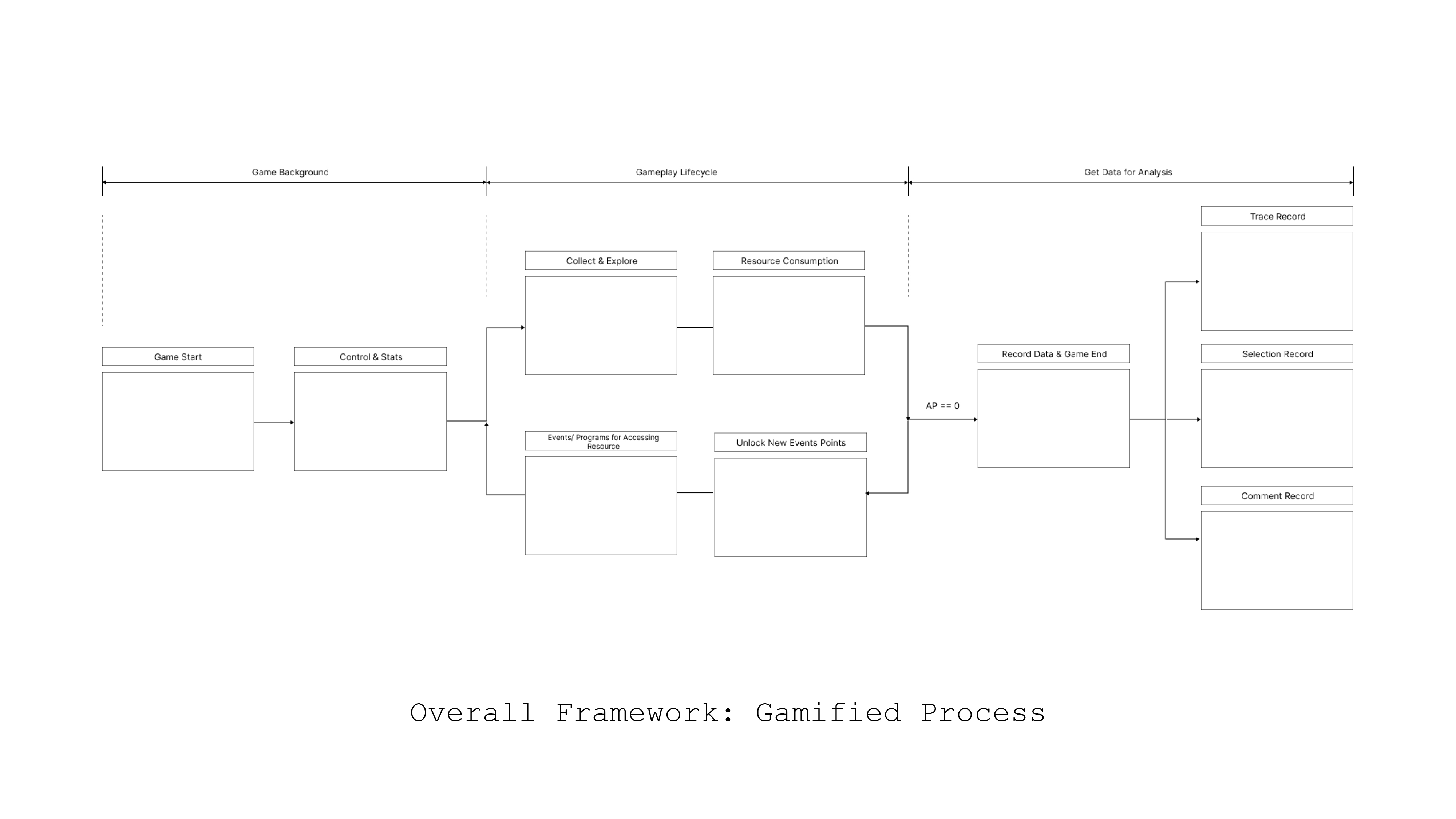 Fig 2. Overall Gamified Process Three stages: game background construction, gameplay lifecycle and getting data from game for analysis. |