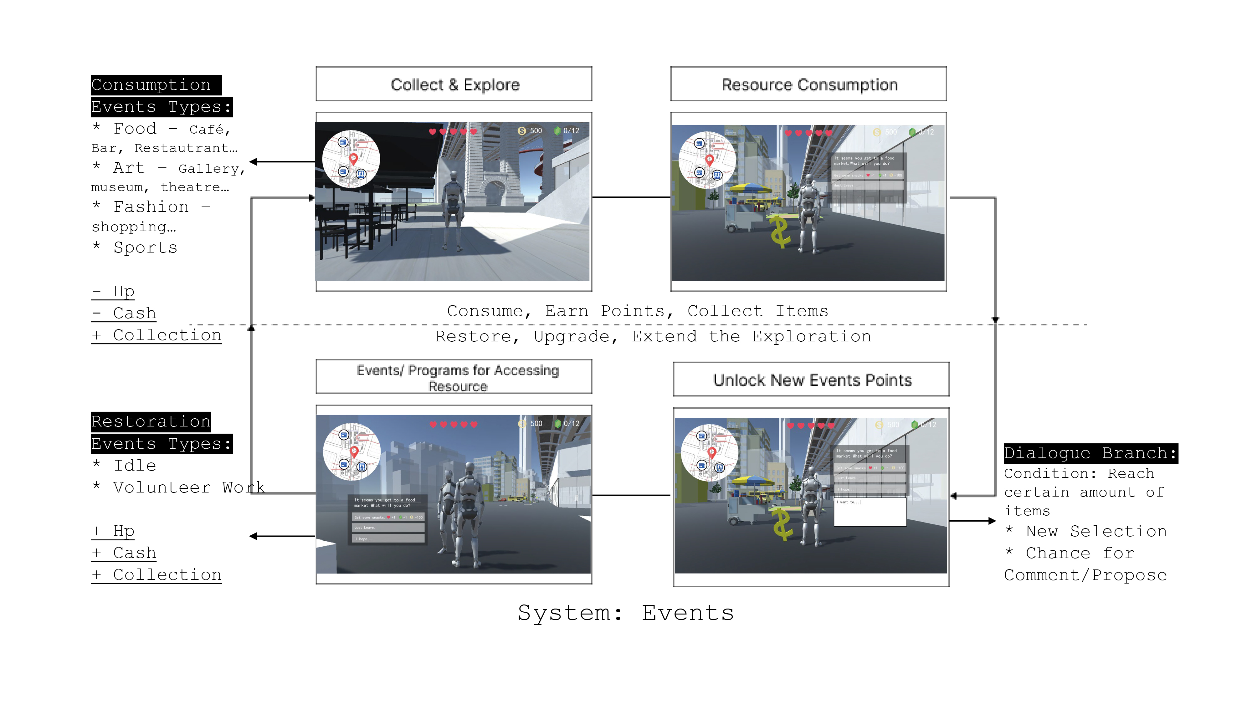 Fig 3. Game System: Events The event system is the core gameplay, which has two types: consumption events to gain item and consume resources, the restoration events to restore resources and gain collection; after the first time of experiencing one events, new dialogue branch will be unlocked for further evaluation and text feedback. |