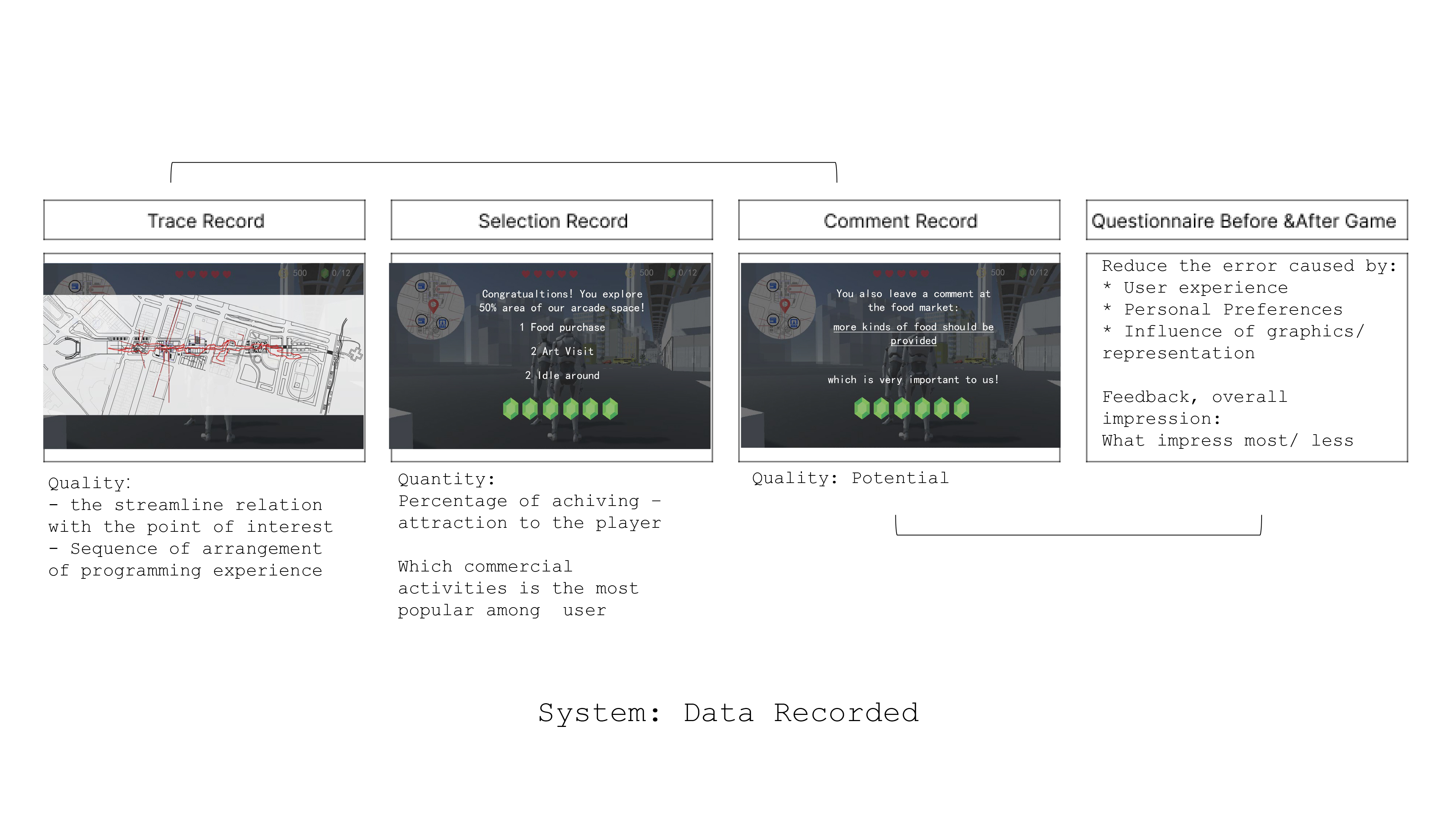 Fig 4. Data Recorded Three types of data will be extracted for analysis: trace record during gameplay, the selection record player make and the comments player put inside the game. After & before game questionnaire will also help to reduce the noise. |