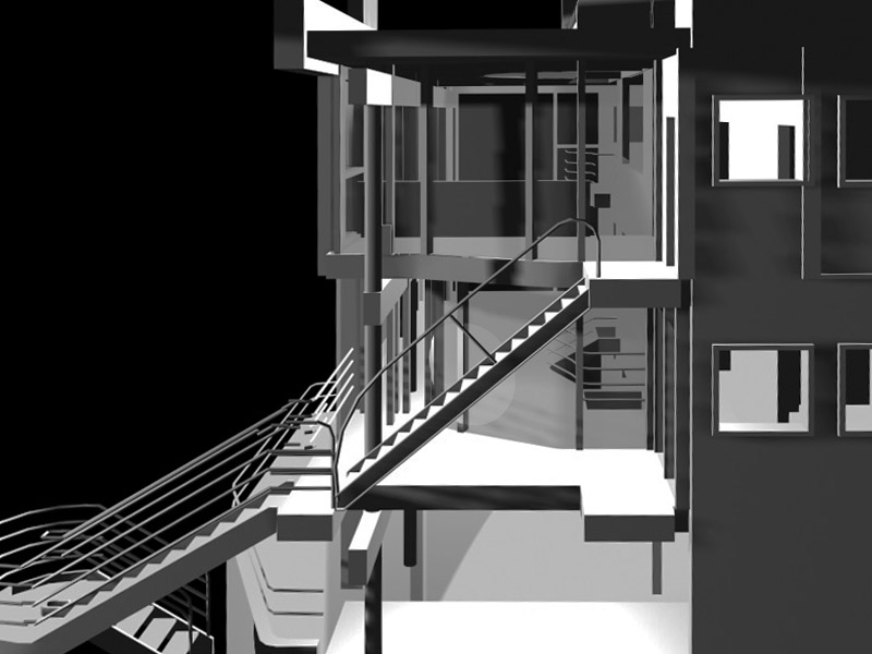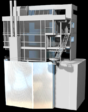 The Douglas House is situated on the steep shores of Lake Michigan and is surrounded by a large number of conifers. It appears like a machine contradicting the natural world, both in color and geometry, therefore asserting its presence but also contradicting the beauty of the landscape. Because of the steep slope you enter the house at the top floor, which is also the only visible part from the road. The volume below contains five more stories and 4,500 square feet of living space. Once you enter the house you can see both the living and the dining levels, and a large roof deck overlooking Lake Michigan. A curved skylight between the entry level and the roof deck, together with the tall smokestacks of the fireplace, help frame the view of the lake.